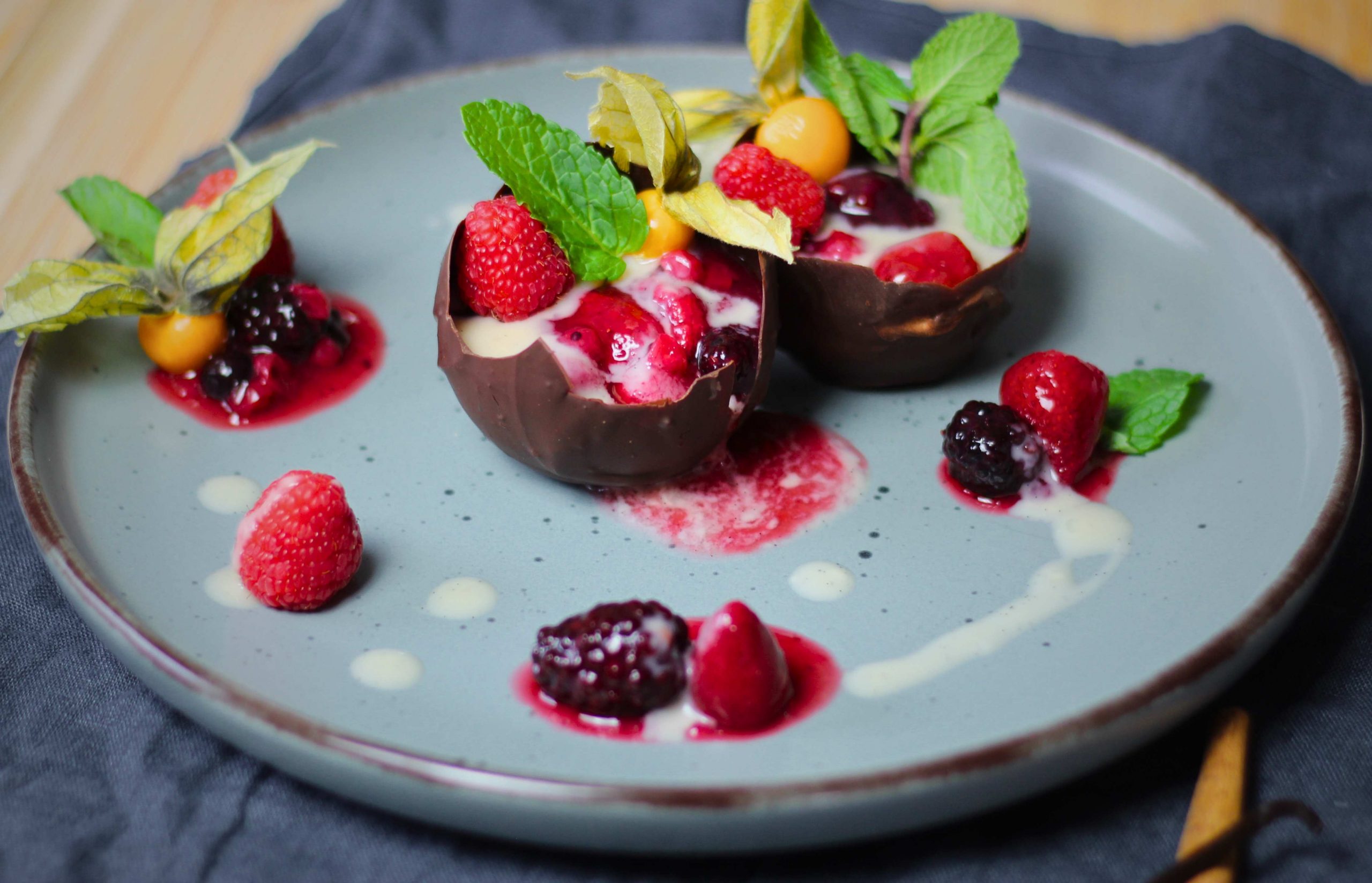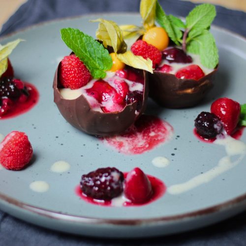 • Für die halben Schokoladeneier die Schokolade klein brechen, in eine Schüssel geben und im warmen Wasserbad schmelzen lassen. Die Wasserballons mit kaltem Wasser so füllen bis sie die gewünschte Größe haben und verschließen. Dann die Wasserballons in die geschmolzene Schokolade tauchen. Den Ballon wenden, so dass er zur Hälfte mit Schokolade bedeckt ist. Anschließend den Ballon mit der Schokoladenseite nach unten auf ein Tablett mit Backpapier stellen und auskühlen lassen. Je kälter die Schokolade ist, desto besser lässt sie sich vom Ballon trennen. Wenn du es geschafft hast, kannst du die halben Schokoladeneier mit der roten Grütze und der Vanillesauce füllen. Anschließend dekorieren und servieren 😉.